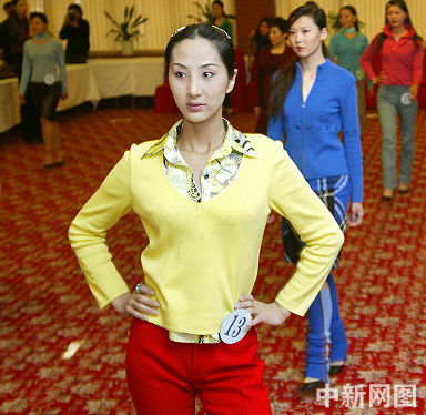 變性人劉小靜與其他參賽選手們練習(xí)臺步,她們?yōu)橹袊讓谜涡〗愦筚愖鲎詈笠淮尾逝拧U问鞘澜邕x美的一大禁忌,而19名參賽選手將于12月18日在北京角逐全國“人造美女”稱號。