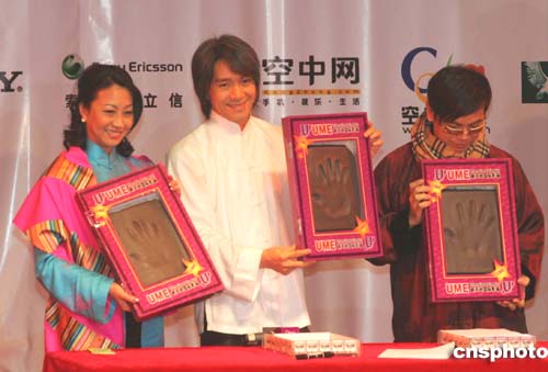 十二月十八日晚,從香港巨星周星馳執導兼主演的賀歲影片《功夫》在上海首映,圖為周星馳與《功夫》演藝人員在上海留手印祝賀首映成功。作者:潘索菲