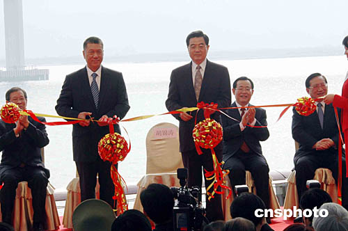 接著,胡錦濤主席與何厚鏵先生一同為西灣大橋落成剪彩。臺下再次響起熱烈的掌聲。