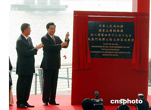 中新社澳門十二月十九日電 題:胡錦濤為澳門西灣大橋剪彩