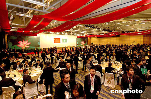 晚七時,在澳門警察局銀樂隊奏響的迎賓曲和二百多名各界嘉賓的熱烈掌聲中,胡錦濤主席和夫人劉永清在澳門特區行政長官何厚鏵及夫人劉渭楨的陪同下步入宴會廳。