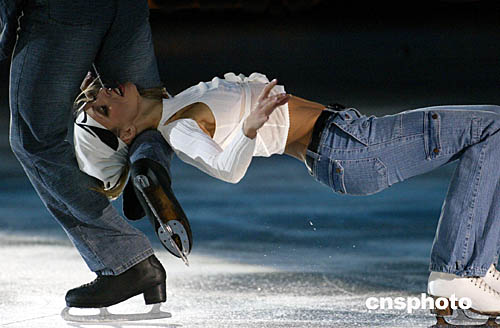 二零零四年十二月十九日,世界花樣滑冰大獎賽總決賽在北京首都體育館落幕,在各個(gè)項(xiàng)目中取得前五名的各國選手再次登臺表演,為北京觀眾奉上一臺完美的視覺盛宴。圖為獲得冰舞冠軍的俄羅斯選手納烏卡/考斯特麥洛夫在表演。中新社記者:武仲林
