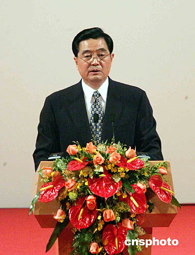 國家主席胡錦濤在澳門回歸五周年慶祝大會上發表重要講話后,何厚鏵請胡錦濤就座。