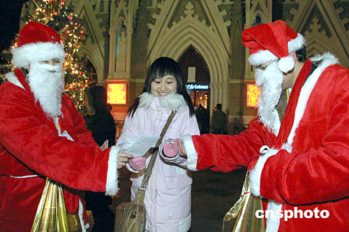 十二月二十四日晚,在北京西什庫教堂門前,“圣誕老人”正在給行人派發圣誕禮物,共度圣誕平安夜。作者:張勤