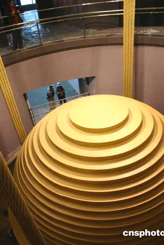| 臺(tái)北101大樓八十九層觀(guān)景臺(tái)12月28日下午向媒體開(kāi)放,樓內(nèi)安裝的世界最大風(fēng)阻尼器引人注目。該風(fēng)阻尼器球體直徑五點(diǎn)五米,重達(dá)六百六十公噸,從大樓九十二層懸掛到八十八層,對(duì)因地震、強(qiáng)風(fēng)造成的水平偏移能產(chǎn)生百分之四十以上的反作用,是世界最大也是唯一外露的風(fēng)阻尼器。作者:黃少華