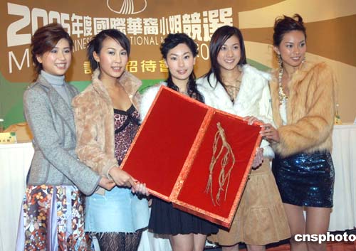《2005年度國際華裔小姐競選》記者會12月29日在香港舉行,應屆港姐季軍符思思(左一)、04年度國際華裔小姐亞軍曹敏莉(左二)、04年度國際華裔小姐冠軍鐘嘉欣(右二)、應屆港姐亞軍朱慧敏(右一)會上向徐子珊送上千年人參,以示鼓勵及支持。作者:鄧慶樂