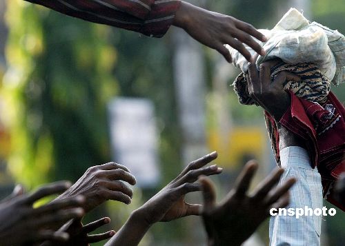 12月26日由印尼強震引發的猛烈海嘯,給印度、斯里蘭卡、泰國、印度尼西亞、馬爾代夫、馬來西亞等國家帶來嚴重災難。各受災國的災后救援工作已經全面展開,數百萬災民急需幫助。圖為在印度災區,災民在領取少得可憐的救濟物資。作者:Ic/cnsphoto