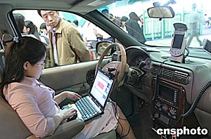 五月中旬,在北京科技周展覽會上,一種可在移動的汽車上完成全套辦公業(yè)務(wù)的“車載辦公室”向觀眾亮相。“車載辦公室”有無線網(wǎng)絡(luò)、衛(wèi)星導(dǎo)航、傳真打印等各種配置。中新社記者:史利