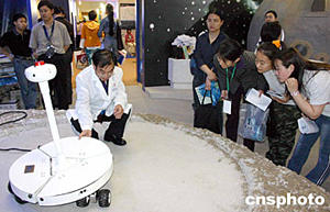 五月中旬,正在北京舉行的“二零零四全國科技活動周暨北京科技周”上一款月球機器人首次亮相。這款機器人名叫“喀嗎哆”,能跨越障礙并進行三百六十度觀察和攝像記錄。作者:徐曦弋