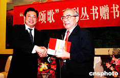 五月十九日,山東省臨沂市在北京人民大會堂舉行《沂蒙頌歌》大型叢書贈書座談會。中共臨沂市委書記李群向曾在沂蒙地區指揮作戰的原中央軍委副主席、國防部長遲浩田(右)贈書。中新社記者:王麗南