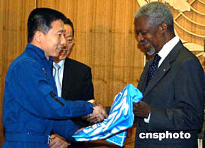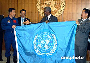 中國(guó)首飛航天員楊利偉(左)代表中國(guó),向聯(lián)合國(guó)秘書長(zhǎng)安南(右)移交了“神舟”五號(hào)飛船所攜載的聯(lián)合國(guó)旗。作者:陳建