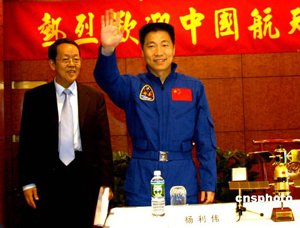 包括楊利偉在內的中國載人航天工程代表團今天上午向聯合國秘書長安南移交了“神舟”五號飛船所攜載的聯合國旗幟后,下午在中國駐紐約總領館與當地僑學界見面。身穿蘭色制服的楊利偉保持著一貫的謙虛,在發言時表示:他的十四名航天員戰友都具備完成首飛任務的能力,他只是一名普通的航天員,是中國人民用智慧的雙手把自己送上了太空。