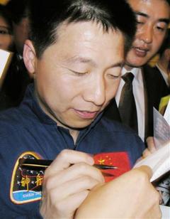 在聯(lián)合國(guó)代表團(tuán)駐地,數(shù)百名各界華人爭(zhēng)先恐后地與楊利偉合影,并贈(zèng)送獎(jiǎng)牌等禮物,其中華裔畫家陳幼白送給楊利偉的畫作“一飛沖天”頗受矚目。