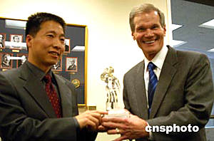 當(dāng)?shù)貢r間五月二十日下午,中國首位進入太空飛行的航天員楊利偉在華盛頓會晤美國上世紀八十年代的航天員、現(xiàn)在的國會參議員比爾·納爾遜。這是楊利偉向納爾遜贈送中國航天員水晶模型。中新社記者:余東暉