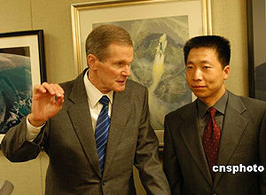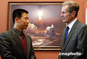 當(dāng)?shù)貢r間五月二十日下午,中國首飛航天員楊利偉在華盛頓拜會美國上世紀八十年代的航天員、現(xiàn)任國會參議員比爾·納爾遜,兩人展開了真誠而幽默的對話。中新社記者:余東暉