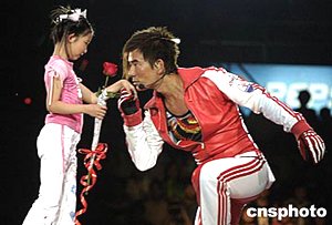 “齊長大”任賢齊北京演唱會五月二十二日晚在首都體育館舉行,演唱會的高潮出現(xiàn)在“香車美女”環(huán)節(jié),任賢齊為一名5歲的小美女單膝跪地送上玫瑰并騎上摩托帶她環(huán)場一周。中新社記者:高遠