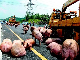 據臺灣媒體報道,一大清早一輛載豬的貨車在南二高嘉義路段突然爆胎翻覆,5、60只豬全被摔出來,有些豬受傷流血,有些嚇得直撒尿,不過大部份的豬生龍活虎跑到馬路上透氣,搗亂了高速公路上的交通。附近民眾看不下去,自動上來幫忙趕豬。