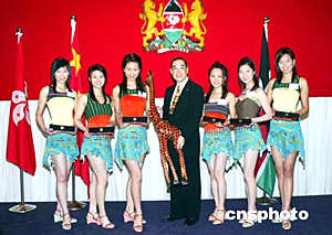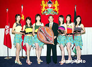 十八位港姐候選佳麗將于29日前赴東非肯尼亞拍攝外景,5月25日出席肯尼亞旅游局舉行之記者會,肯尼亞駐港澳名譽領事兼旅游局(遠東區)專員譚榮根博士向7至12號候選佳麗(右起)頒贈富有肯尼亞特色的紀念品,并祈求外景拍攝順利。作者:鄧慶樂