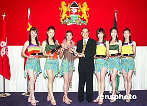 十八位港姐候選佳麗將于29日前赴東非肯尼亞拍攝外景,5月25日出席肯尼亞旅游局舉行之記者會,肯尼亞駐港澳名譽領事兼旅游局(遠東區)專員譚榮根博士向1至6號候選佳麗(右起)頒贈富有肯尼亞特色的紀念品,并祈求外景拍攝順利。作者:鄧慶樂