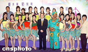 十八位港姐候選佳麗將于29日前赴東非肯尼亞拍攝外景,5月25日出席肯尼亞旅游局舉行之記者會,十八位港姐候選佳麗與肯尼亞駐港澳名譽領事兼旅游局(遠東區)專員譚榮根博士及肯尼亞航空公司遠東區經理MsMeritaA.Ombuor等于會上合照。作者:鄧慶樂