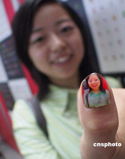 5月26日,一名年輕女性在江蘇展覽館向人們展示以自己形象為圖案的指甲。正在這里舉辦的第七屆美容美發(fā)博覽會上展示的最新技術(shù)數(shù)碼美甲機可以將各種圖案畫在你的指甲上,甚至是你自己或家人的照片。秦淮 攝