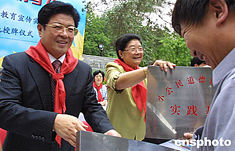 二十九日,由中國婦聯(lián)主辦的“為國教子、以德育人”家庭教育實踐活動暨中國小公民道德建設(shè)活動實踐基地授牌儀式在中國兒童中心舉行。圖為中共中央政治局委員王兆國(左)、中國婦聯(lián)主席顧秀蓮為承辦活動的基地代表授牌。中新社記者:廖文靜
