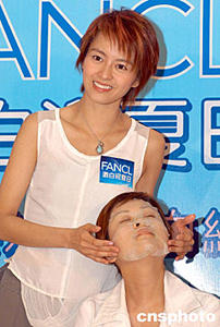 歌星梁詠琪5月29日在香港出席其代言化妝護膚品《FANCL激白迎夏日》宣傳展覽會,梁詠琪邀請現場觀眾,親自為她敷上面膜。作者:鄧慶樂