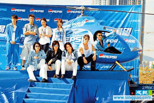 在直升機場上,先安排九位巨星為“百事”小型直升機進行揭幕儀式,又與直升機合照。“城城”識搶位,第一時間沖入直升機坐上機師位,其它巨星就只是在飛機旁合照。