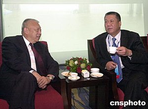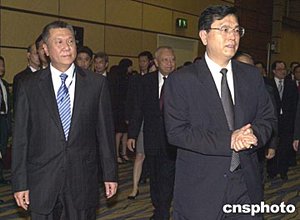 澳門特區行政長官何厚鏵與香港特區行政長官董建華在論壇開始前交談。作者:梁永強