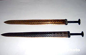 六月初,湖北省博物館專家對(duì)所謂“高仿真”的越王勾踐劍進(jìn)行了技術(shù)鑒定,有關(guān)專家認(rèn)為所謂“高仿真”劍與真品差異很大,并聲明“高仿真”行為不合法,應(yīng)立即停止。近日,湖北荊州有人聲稱“破解”了越王勾踐劍千年不銹之謎,準(zhǔn)備建立生產(chǎn)基地批量生產(chǎn)“高仿真”劍。圖為越王勾踐劍(下)與“高仿真”劍(上)的對(duì)比。作者:艾啟平