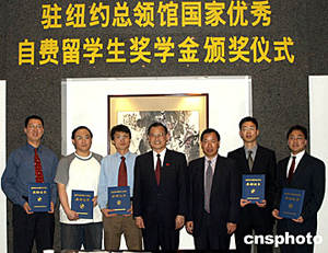美東時間六月六日下午下午,中國駐紐約總領事劉碧偉(左四)和教育參贊艾方林(右三)向獲得首屆“國家優秀自費留學生獎學金”美國紐約領區的留學生頒發證書和獎金。據悉,這是中國政府首次對自費留學生給予獎勵,獲獎者包括在美國、德國、日本、法國、英國留學的九十五名自費留學生。作者:趙海燕