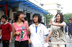 六月八日,全國統一高考結束,北京莘莘學子們步出考場高興地和焦急等待著的家長打招呼。中新社記者:張勤