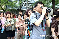 六月八日,北京高考最后一科考試結束后,在考場外焦急等待的考生家長們拿起攝影機為孩子拍下這一生中的難忘一刻。 中新社記者:張勤