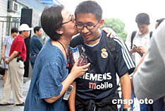六月八日,全國高考結束,北京第四中學考點外的一位母親對剛剛步出考場的孩子送上深情地一吻,祝賀孩子順利完成高考。中新社記者:張勤
