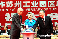 六月十日上午,數(shù)千中外嘉賓歡聚在蘇州金雞湖畔,熱烈慶祝中國--新加坡合作蘇州工業(yè)園區(qū)成立十周年。中國國務(wù)院副總理吳儀和中新兩國當(dāng)年的簽約人李嵐清、新加坡內(nèi)閣資政李光耀出席會議并共同啟動慶祝活動按鈕。作者:蔣振江