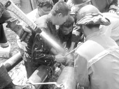 據朝陽市消防局副局長姚安介紹:“我們共出動70余名官兵、10臺消防車。由于汽油管道發生炸裂,引起了另一條柴油輸送管道的法蘭盤(管道的接頭)向外泄漏柴油,現在這7條輸油管道每條里都有5噸油,一旦引爆后果不堪設想。我們用兩臺泡沫滅火車和若干水槍給管道降溫,同時用來稀釋泄漏的柴油,并更換法蘭盤!