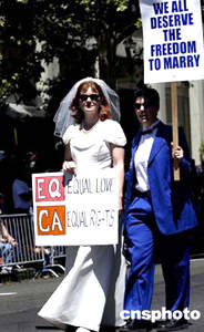 美西加州圣荷西市六月十三日舉行第二十九屆同性戀游行,一對同性伴侶手舉“我們都有權(quán)自由結(jié)婚”、“同樣的愛、同等的權(quán)利”標(biāo)語牌參加游行。目前,麻塞諸塞州是美國唯一批準(zhǔn)同性伴侶婚姻合法的州。作者:陳鋼