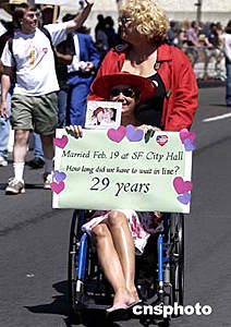 美西圣荷西市六月十三日舉行第二十九屆同性戀游行,一對相戀二十九年、今年二月十九日在加州舊金山市政府登記結(jié)婚的同性伴侶參加游行。現(xiàn)在,舊金山和圣荷西市所在的加利福尼亞州法院尚未批準(zhǔn)同性婚姻合法。作者:陳鋼