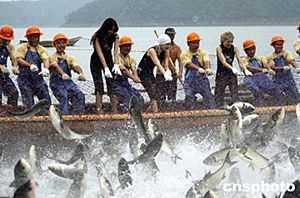 6月21日,參加2004年國際旅游小姐冠軍總決賽的選手們來到浙江著名旅游景區千島湖與漁民一起進行大網捕魚,體驗豐收的喜悅。中新社記者:盛佳鵬