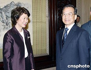 中國國務院總理溫家寶六月二十二日在北京中南海會見來訪的美國勞工部長趙小蘭。中新社記者:毛建軍