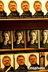圖為曼哈頓巴恩斯·諾布爾書店的書架上擺放著克林頓夫婦兩人的回憶錄。