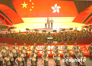 為慶祝香港回歸祖國七周年,中國人民解放軍400人的藝術團將于今日和24日在香港紅磡體育館舉行兩場盛大演出。圖為全體演職人員正在現(xiàn)場進行最后的演出排練。中新社記者:趙振清