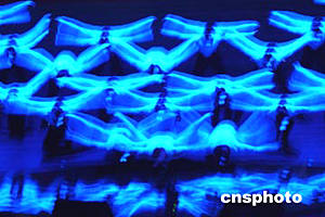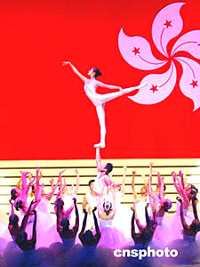 中國人民解放軍藝術團運用雜技的托、拋、翻等高雅技巧和西方芭蕾相稼接,向香港觀眾獻上驚險、刺激、漂亮的〈東方天鵝〉。中新社記者:趙振清