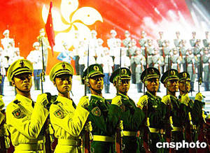 為慶祝香港回歸祖國七周年,中國人民解放軍四百人組成的藝術團六月二十三日在香港紅磡體育館舉行首場盛大演出。圖為駐港部隊三軍儀仗隊參加演出。中新社記者:錢興強