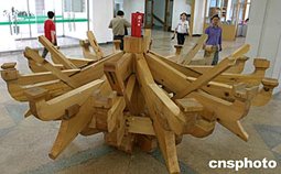 由北京奧組委主辦的第二屆“北京2008奧林匹克文化節”系列活動之“天韻”人文奧運藝術作品邀請展在中國人民大學開展,圖為擺放在學校圖書館大廳的參展作品“朵”。中新社記者:廖文靜