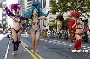 六月二十七日,美國舊金山市舉行第三十四屆同性戀游行。圖為一對打扮“香艷”的男子參加游行。 作者:陳鋼