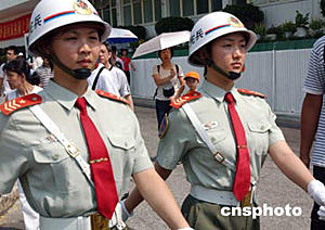 為慶祝香港回歸祖國(guó)七周年,中國(guó)人民解放軍駐香港部隊(duì)于七月一日舉行三軍軍營(yíng)開(kāi)放活動(dòng),在赤柱軍營(yíng)兩名女憲兵展示風(fēng)采。 作者:錢興強(qiáng)