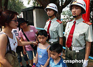 為慶祝香港回歸祖國七周年,進一步增進香港各界對駐港部隊的了解,中國人民解放軍駐香港部隊于七月一日舉行三軍軍營開放活動,圖為眾多香港市民冒酷熱來到軍營參觀。作者:錢興強