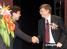 微軟公司董事長兼首席軟件架構(gòu)師比爾·蓋茨,7月1日出席在北京舉行的2004微軟新技術(shù)展望大會,并為2500余名大學生及2000位軟件開發(fā)人員演講,并共同探討未來無縫計算的發(fā)展趨勢。圖為微軟亞洲研究院院長沈向洋(左)與比爾·蓋茨握手。中新社記者:張宇