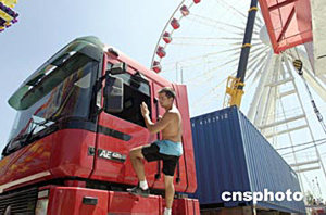首次進入北京的世界最大“移動游樂場”——環球嘉年華原定于七月二日在國際雕塑公園向市民正式開放,但七月一日突降的大雨致使開放時間推遲。圖為工作人員在進行最后的緊張調試。作者:徐曦弋